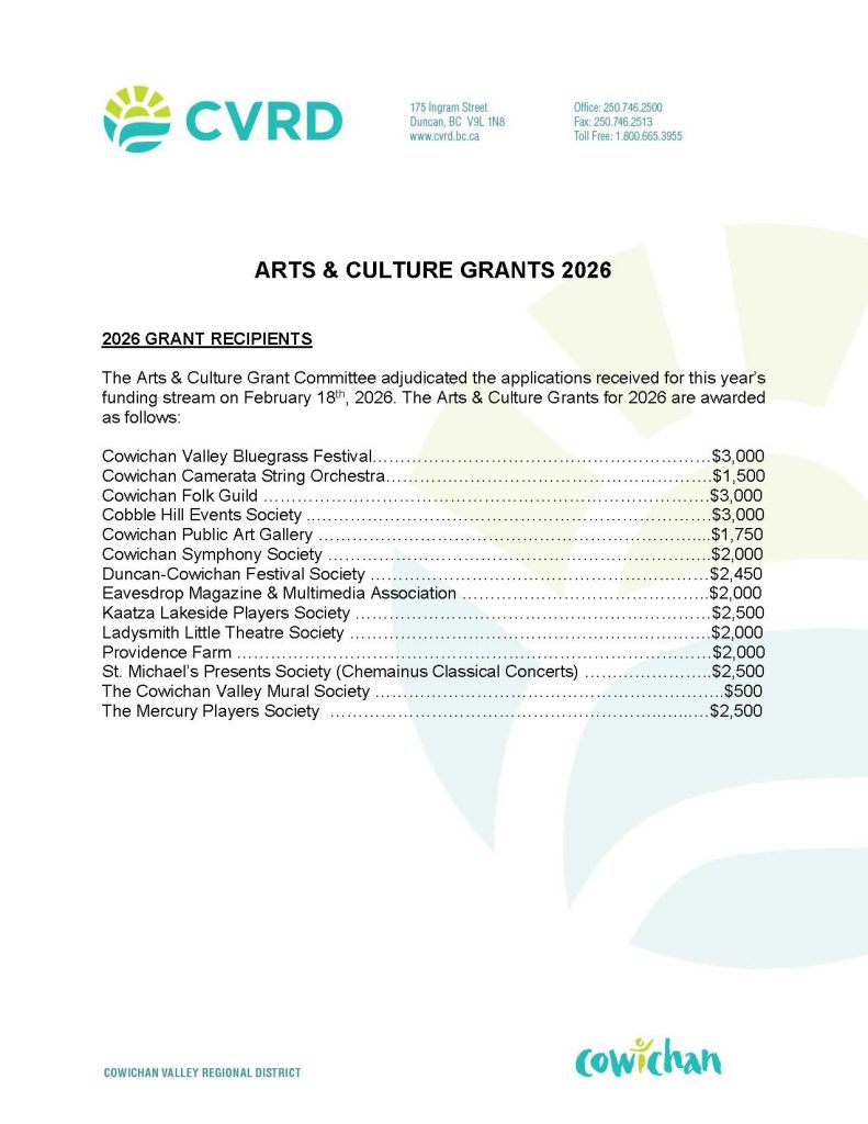 Arts & Culture Grants provide financial assistance to organizations that benefit the residents of the Cowichan Valley Regional District. The funding is decided by the CVRD Arts & Culture Adjudication Committee. Applications for the 2026 grant stream open on December 1, 2025. The deadline for application is January 31, 2026.