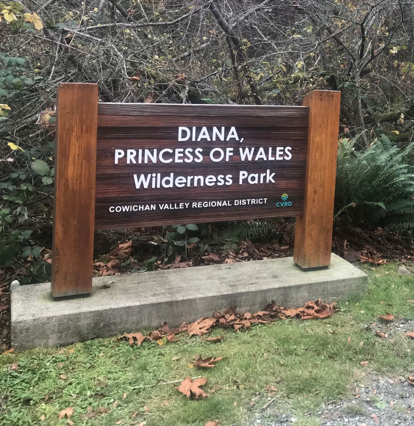 The sisters also desired the park to be named after Diana, Princess of Wales to commemorate her recent passing and to honor the sisters connection to the United Kingdom. Through communication with the Royal Family, Patricia Doornbosch achieved official approval to apply Diana, Princess of Wales Wilderness Park title to this new CVRD park.
